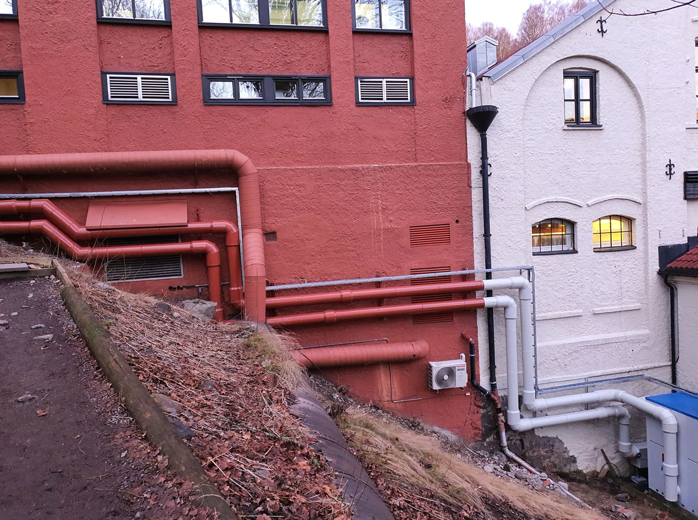 Verneverdigbygg med kombikurs isolering 2 lag 19 mm armacell og mantlet med farger så nærebygget farger vi kunne finne.